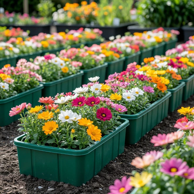 В ассортименте — модели длиной 1–3 м, высотой 20–40 см и шириной 60–120 см: прямоугольные, угловые, круглые, с разделителями и системой капельного полива.